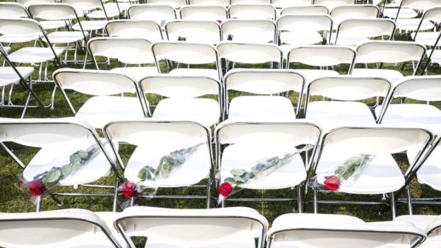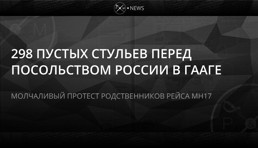 Возле посольства расставили пустые стулья. На 298 белых стульях лежало по одной красной розе в память о погибших, большинство из которых были гражданами Нидерландов.