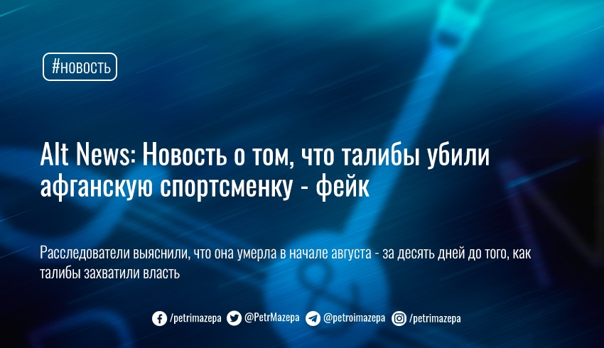 - Отметим, New York Post и огромное количество других изданий (о которых упоминают Alt News) написали, что семья Махджабин Хакими подвергалась угрозам со стороны талибов и поэтому о ее смерти стало известно только сейчас, хотя она погибла в начале сентября. Более того, информация об убийстве спортсменки «Талибаном» была подтверждена афганским центром журналистских расследований PAYK.
