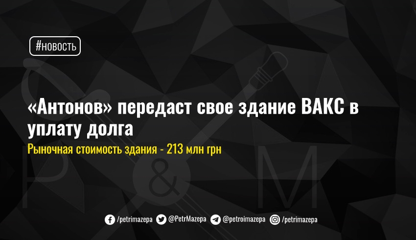 «Антонов» передаст ВАКС здание в Киеве площадью 4,28 тыс. кв. м. Рыночная стоимость этого здания - 213 млн грн. Эту сумму при передаче должны списать с долгов «Антонова». Таким образом авиазавод почти вдвое уменьшит долг перед государством в сумме 424 млн грн.