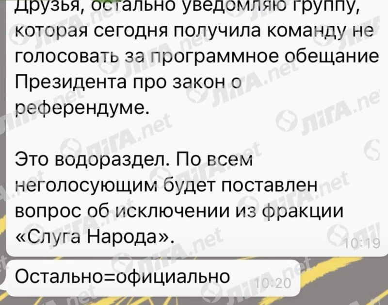 В чате «Слуг народа» глава одноименной фракции Давид Арахамия поставил жесткое условие – всех, кто не проголосует за президентский законопроект о референдуме, попытаются исключить из фракции.