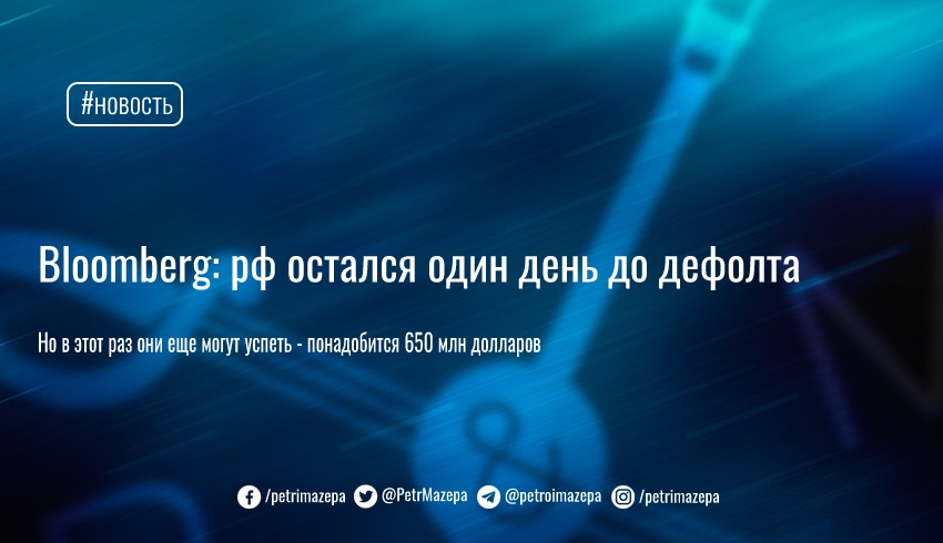 У россии осталось чуть менее дня, чтобы избежать дефолта и успеть выплатить инвесторам 650 млн долл. купонов и основных платежей по выпускам двух серий облигаций с погашением в 2022 и 2042 годах.