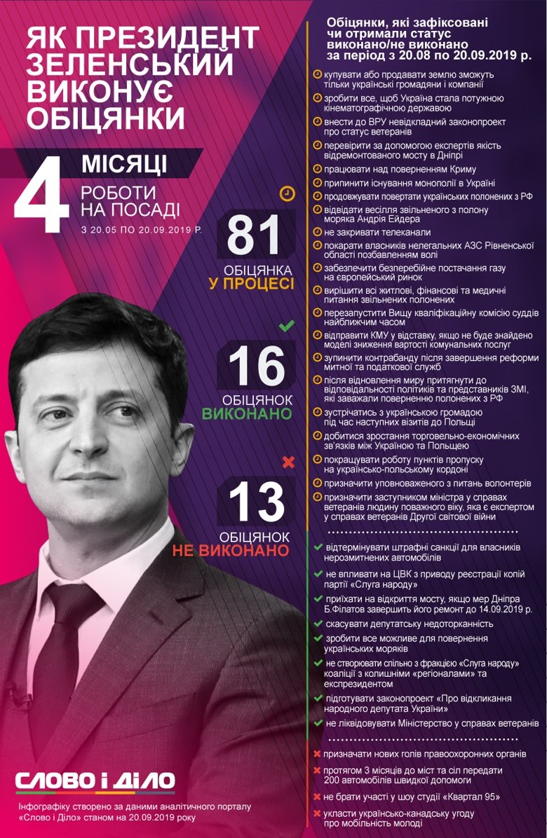 «Слово и дело» продолжает отслеживать обещания главы государства. Всего по состоянию на момент выхода этого обзора Зеленский дал 200 обещаний, включая предвыборные и программные. Если же считать со дня инаугурации, в течение четырёх месяцев работы президент дал 98 обещаний. За это же время Зеленский исполнил 16 обещаний, провалил — 13.