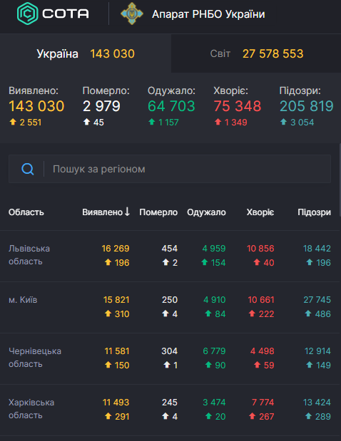 Вчера в Украине подтвердили 2 551 новый случай COVID-19. Количество выздоровевших за сутки – 1 157 человек (всего с начала пандемии 64 703 человека), а умерших – 45 человек (2 979 человек).