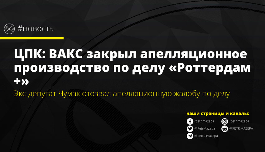 Бывший депутат Виктор Чумак отозвал апелляционную жалобу на решение судьи ВАКС, принявшей решение отказать в возобновлении дела «Роттердам +». Апелляция Высшего антикоррупционного суда приняла отказ Чумака и закрыла апелляционное дело, пишет Центр противодействия коррупции.