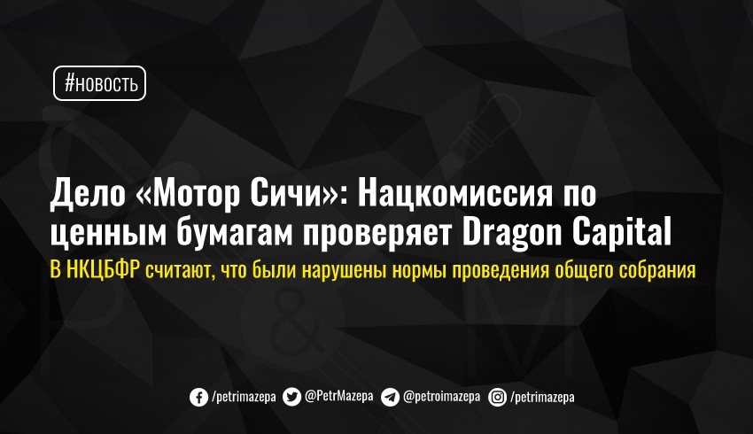 Национальная комиссия по ценным бумагам и фондовому рынку (НКЦБФР) открыла дело в отношении депозитарного учреждения ООО Dragon Capital, на счетах которого в ценных бумагах размещены акции «Мотор Сичи». В Комиссии считают, что созыв и намерение провести общее собрание акционерного общества «Мотор Сич» не соответствует действующему законодательству.