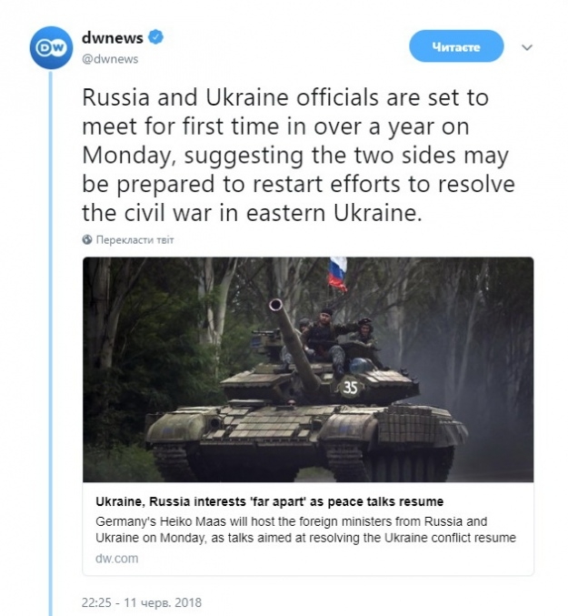 Вчера на англоязычной версии Deutsche Welle вышла статья, посвящена встрече глав МИД стран нормандской четверки в Берлине. В тексте статьи агрессия РФ против Украины называется «гражданской войной».