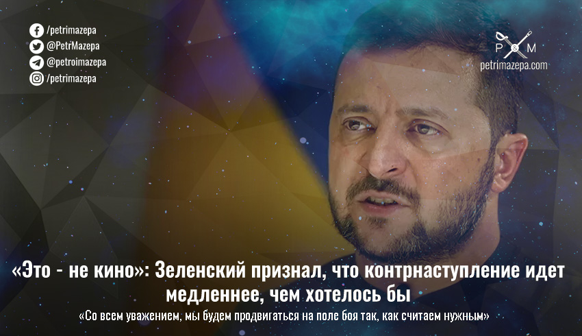 Президент Владимир Зеленский признал, что контрнаступление продвигается медленнее, чем нам хотелось бы, но это не голливудский фильм, здесь жизнь людей стоит на кону, и Украина будет продвигаться на поле боя так, как считает нужным.