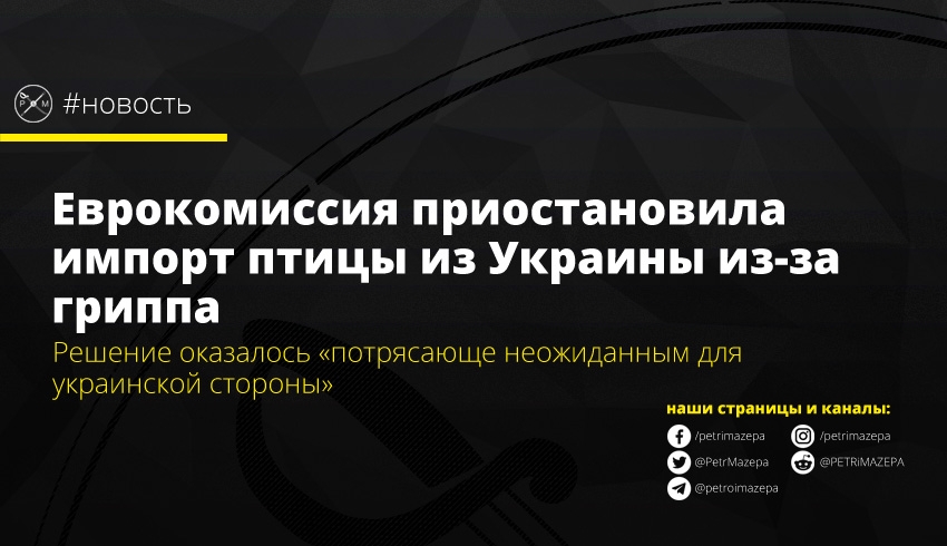 Вчера вечером Европейская Комиссия прислала в Украину письмо о том, что временно приостановлен ввоз из Украины на территорию ЕС мяса птицы, мясной продукции из птицы и термически необработанных продуктов из птицы. При этом яйца и яичная продукция под данные ограничения не попадают.