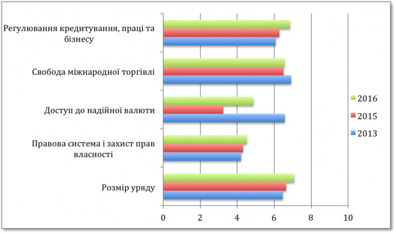 Согласно сводной таблице, Украина в период с 2013 года по 2016 год сильнее всего просела, а затем начала нагонять упущенное в категории «Доступ к надежной валюте». В гораздо более облегченном варианте те же «качели» наблюдаются и в категории «Свобода международной торговли». Остальные три категории показывают незначительный, но постоянный рост.Как отмечает Liga.net Украина сохраняет хорошие позиции (52 место из 162) по размеру правительства (расходы, налоги и предприятия).