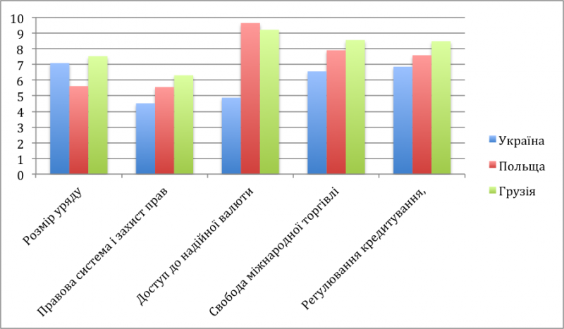 «Опубликованный в отчете индекс рассчитывается на основе 42 показателей, которые объединены в пять широких категорий (размер правительства, правовая система и защита прав собственности, доступ к надежной валюте, свобода международной торговли, регулирования кредитования, труда и бизнеса)», - сообщает Bendukidze Free Market Center.