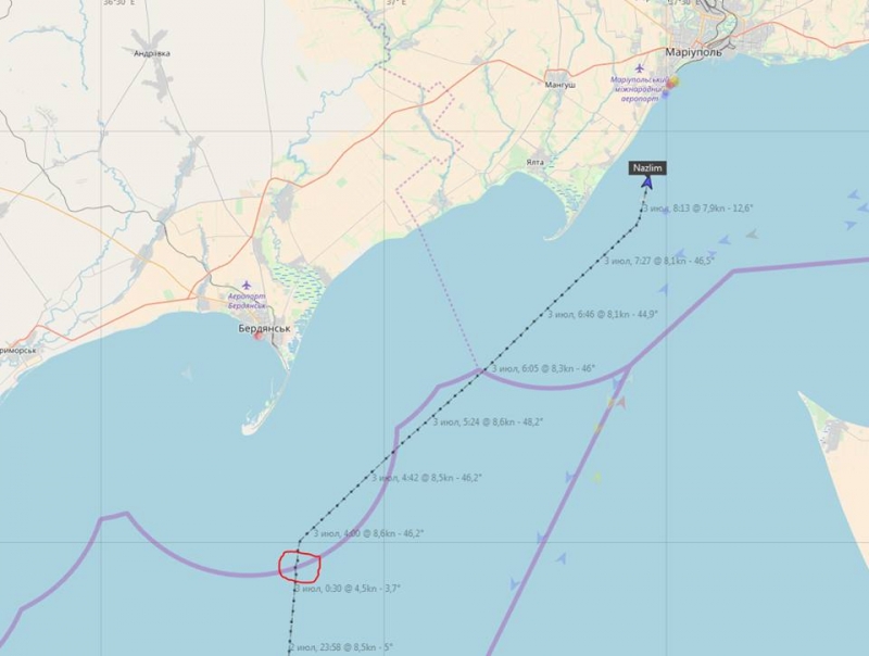 Сегодня ночью, ориентировочно в 00:30, на расстоянии 11 морских миль (20 км) к югу от Бердянской косы (46°28'06" N 36°50'34" E), береговой охраной ФСБ РФ задержан турецкий сухогруз NAZLIM (IMO: 7802122), что шел в Мариуполь. Задержка длилась 3 часа – с 00:30 до 03:30.