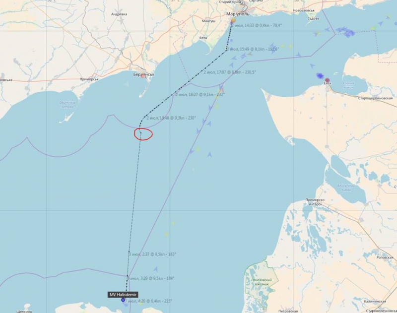 По его данным, вчера, ориентировочно в 20:30 на расстоянии 12 морских миль (22 км) к югу от Бердянской косы (46°25'59" N 36°45'52" E), береговой охраной ФСБ РФ задержан турецкий сухогруз HALISDEMIR (IMO: 9517331), шедший из Мариуполя в Туркели (Турция). Задержка длилась два часа – с 20:30 до 22:30.