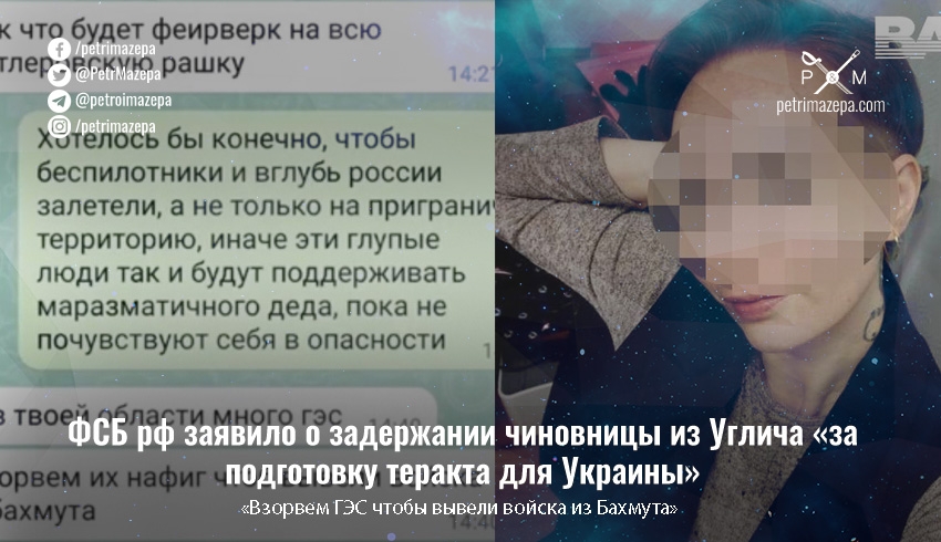 ФСБ России отметилось новым задержанием «агента Украины» — теперь им стала сотрудница администрации Углича, Ярославская область, которая якобы по заданию СБУ готовила подрыв плотины местной ГЭС, чтобы россия «вывела войска из Бахмута».