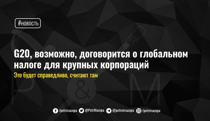 На встрече министров финансов и руководителей центральных банков Большой двадцатки, запланированной на июль, могут договориться о введении глобального налога минимального для крупных корпораций в размере 15%.