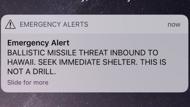 Все жители получили на свои мобильные телефоны предупреждение с текстом «Угроза приближается к Гавайям в виде баллистической ракеты. Немедленно бегите в укрытие. Это не учебная тревога».