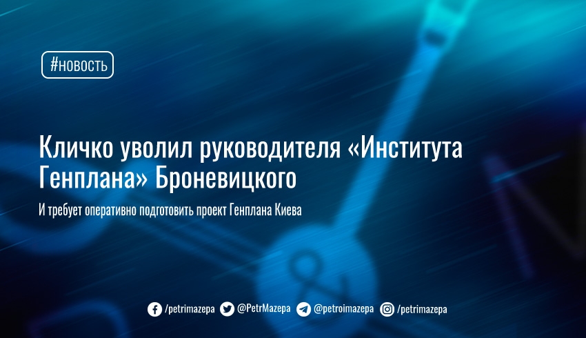 Городской глава Киева Виталий Кличко уволил руководителя КО «Институт Генплана города Киев» Сергея Броневицкого. Причина – затягивание подачи проекта Генерального плана столицы на обсуждение общественности и рассмотрение Киевсоветом.