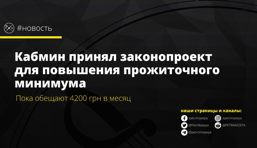 Премьер-министр Украины Алексей Гончарук сообщил, что Кабмин одобрил законопроект, который позволит в дальнейшем повысить прожиточный минимум. По предварительным расчетам ожидается рост этого параметра до 4200 грн в месяц.