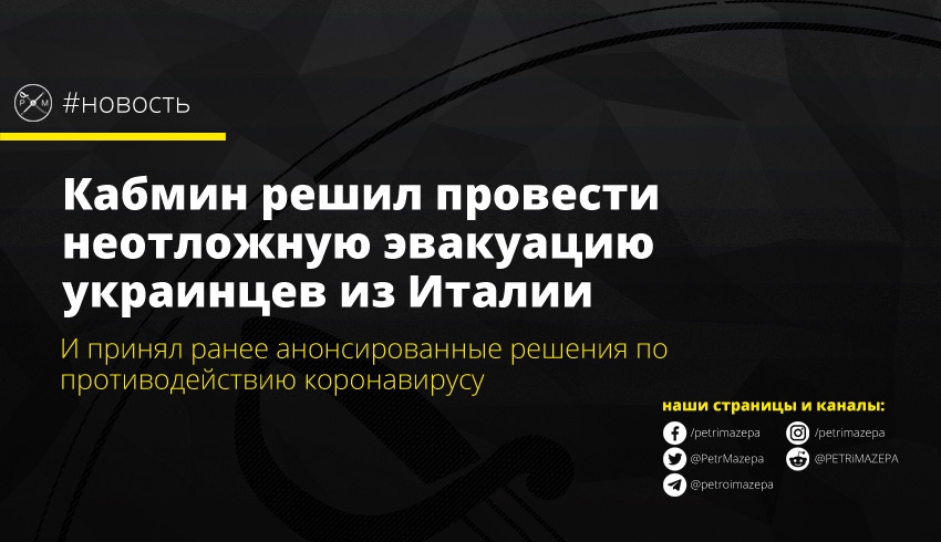 Правительство поручило Министерству инфраструктуры совместно с Минздравом, МИД и МВД обеспечить неотложную эвакуацию граждан Украины из зоны вспышки COVID-19 в Италии. Также был принят ряд постановлений по итогам вчерашнего СНБО и обращения президента Владимира Зеленского.