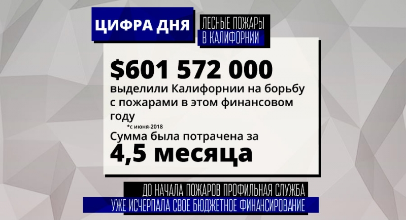 Как сообщает CNN, в данный момент казна региона выделила на ликвидацию последствий 601 572 000 долларов. Эти деньги были потрачены довольно быстро – всего за 4,5 месяца (финансовый год начался в июне 2018-го). Также ситуацию усложняет тот факт, что к моменту начала лесных пожаров Государственное агентство лесного хозяйства и пожарной охраны уже исчерпало свое бюджетное финансирование.