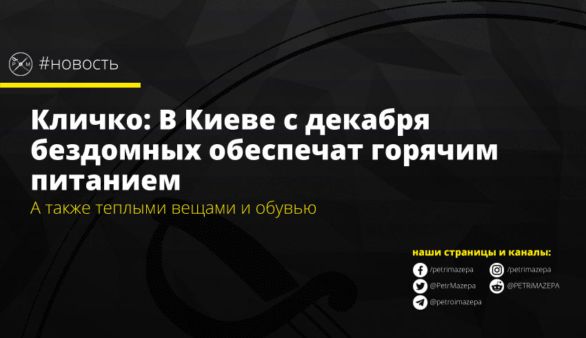 Городской голова Киева Виталий Кличко заявил, что с 1 декабря этого года и до 1 апреля 2021 года бездомных в столице будут обеспечивать горячим питанием, теплыми вещами, обувью и санитарно-гигиеническими средствами.