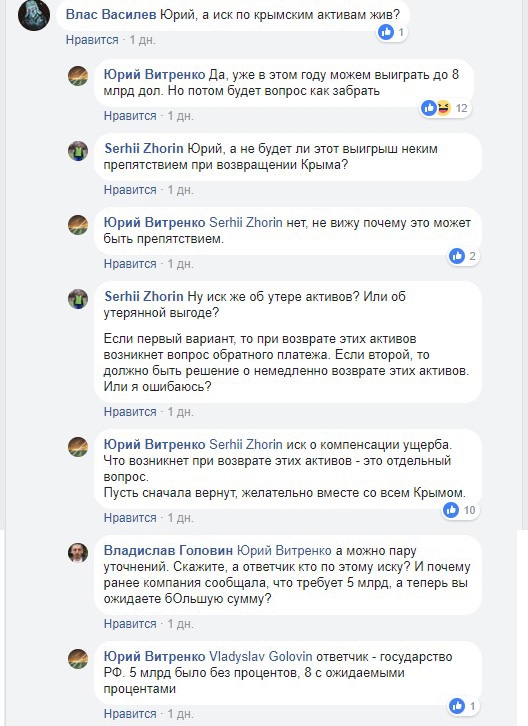 "Речь идет об иске о компенсации убытков. Что возникнет при возвращении этих активов - это отдельный вопрос. Пусть сначала вернут, желательно вместе со всем Крымом. Ответчик - государство РФ. 5 млрд было без процентов, 8 с ожидаемыми процентами", - пояснил главный коммерческий директор «Нафтогаза Украины» Юрий Витренко в Facebook.