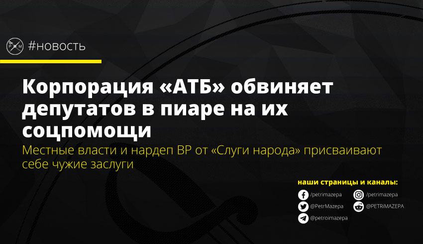 «С 3 апреля 2020 года Корпорация «АТБ» запустила совместный с Министерством социальной политики Украины благотворительный проект адресной помощи социально незащищенным слоям населения в виде продуктовых наборов и товаров повседневного потребления», - сообщает корпорация, - «как выяснилось, в отдельных случаях представители органов местного самоуправления и депутаты разного уровня присваивают инициативу реализации проекта в свою сторону, сознательно вводя в заблуждение получателей помощи и решая таким образом свои будущие политические амбиции».