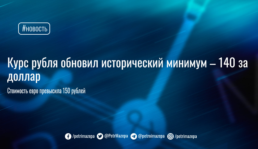 Курс российского рубля в понедельник снова упал, обновив исторический минимум – 140 за доллар. Стоимость евро превысила 150 рублей.