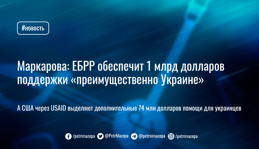 Посол Украины в США Оксана Маркарова сообщила, что Минфин США подписал соглашение с ЕБРР о взносе в 500 млн долл. для поддержки Украины и других пострадавших стран. И теперь ЕБРР сможет обеспечить 1 млрд долл. поддержки «преимущественно Украине». А напрямую США через USAID выделяют дополнительные 74 млн долларов помощи для украинцев.