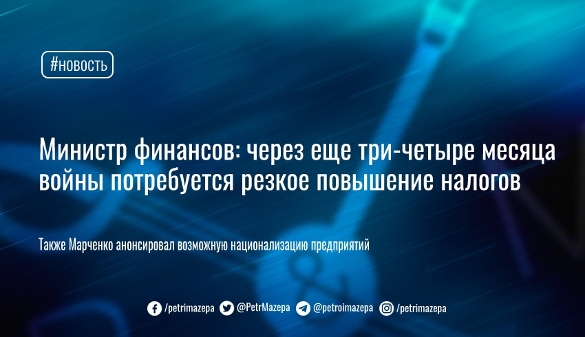 Министр финансов Украины Сергей Марченко заявил, что через еще «три-четыре» месяца такой войны страна вынуждена будет принять болезненные меры в экономике. Например — резкое повышение налогов и проведение национализации. Пока прогнозы говорят, что в 2022 году ВВП Украины упадет на 44-45%.