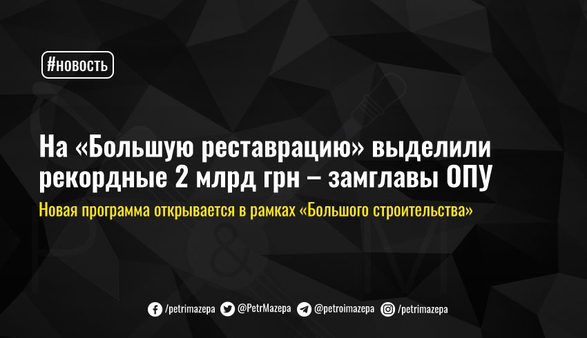 «Президентом было принято решение об открытии новой программы в рамках "Большого строительства", которая называется "Большая реставрация". Это программа восстановления и реставрации объектов культурного наследия - театров, замков, музеев, крепостей и так далее … На программу "Большая реставрация" выделена рекордная сумма в истории Украины - 2 миллиарда грн», - сообщил замглавы ОПУ Кирилл Тимошенко, пишет «Интерфакс-Украина».