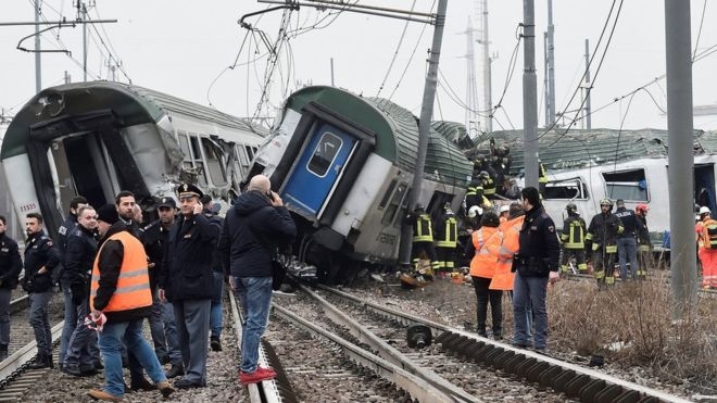 В пригороде Милана сегодня утром сошёл с рельсов пассажирский поезд. В результате погибли четыре человека, около ста были ранены, причём состояние пяти пострадавших оценивается как критическое. На то, чтобы извлечь пассажиров из покорёженных вагонов, спасателям понадобилось более трёх часов.