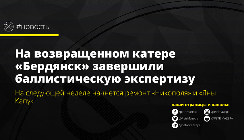 «Катер и буксир («Никополь» и «Яни Капу», — прим. ред.) уже на следующей неделе отправятся на завод, второй катер, «Бердянск», встанет на ремонт немного позже. Дело в том, что мы долго ждали результатов баллистической экспертизы. Она была проведена на позапрошлой неделе. Были сняты фрагменты брони, осколки снарядов — все эти доказательства будут фигурировать в международных судах, как и пуля от снайперской винтовки, выпущенная по нашему самолету Ан-26 в феврале 2017 года», - сказал Воронченко в комментарии «Думской».