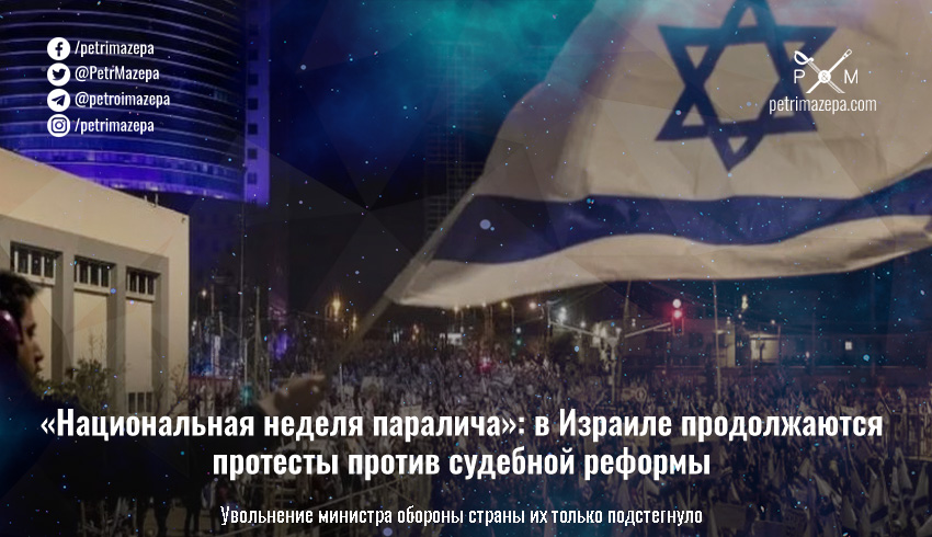 Президент Израиля Ицхак Герцог призвал власти в Израиле «немедленно остановить законодательный процесс». Университеты объявили забастовку, а целый ряд мэров и глав региональных советов анонсировал голодовку. С сегодняшнего дня в Израиле начали «Национальную неделю паралича» — серию демонстраций и забастовок против судебной реформы, которую критики считают посягательством на демократию.