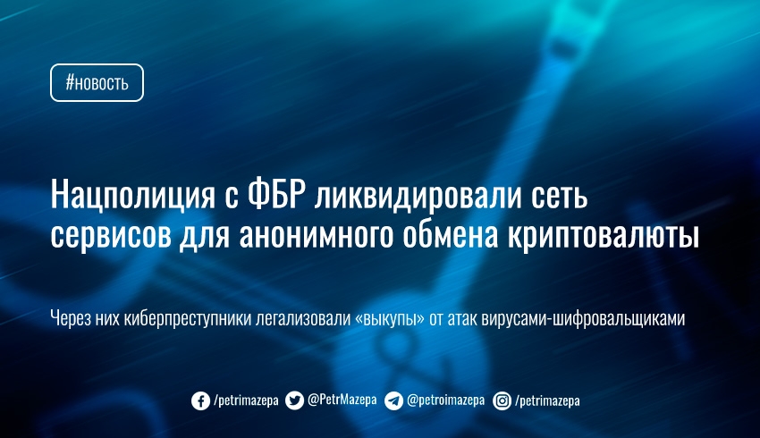 Национальная полиция совместно с ФБР ликвидировала сеть сервисов для обмена криптовалюты, полученной преступным путем. Заблокированные сервисы предоставляли возможность кибеспреступникам легализовать активы, полученные в качестве «выкупов» от атак вирусами-шифровальщиками.