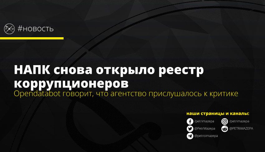 «На прошлой неделе мы сообщили, что реестр коррупционеров больше не обновляется. Нас поддержало большинство коллег-журналистов, которые распространили информацию об этом. В ответ Минюст сообщил, что сейчас реестром коррупционеров занимается НАПК. А НАПК в свою очередь сказало, что человека можно проверить на их сайте. Тем не менее, сегодня реестр коррупционеров появился на государственном портале открытых данных», - информирует «Opendatabot».