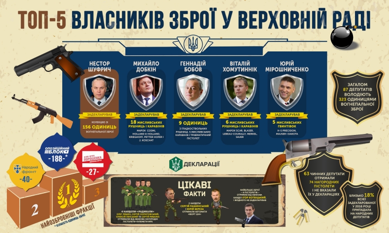 «Около 18% всего задекларированного в 2016 году оружия приходится именно на народных депутатов. А если свести данные деклараций и наградных списков, то в общем итоге получается, что 87 народных избранников обладают 323 единиц огнестрельного оружия», - сообщает Bihus.Info