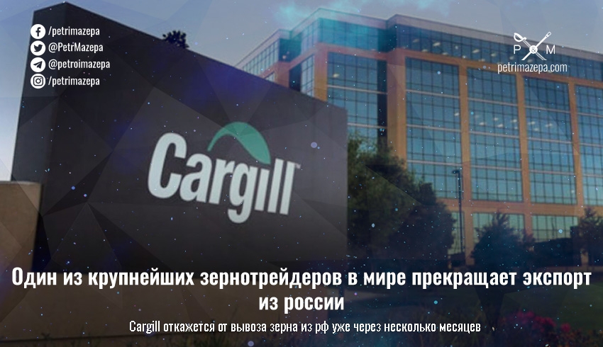 Один из крупнейших поставщиков сельскохозяйственной продукции, американская компания Cargill, прекращает работу в россии. Один из топ-10 экспортеров российского зерна планирует отказаться от экспорта из страны-агрессора уже в следующем сельскохозяйственном году, то есть с 1 июля.