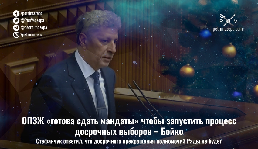 Со-глава фракции ОПЗЖ Юрий Бойко выступил с заявлением с трибуны ВР – якобы его фракция готова сдать мандаты, чтобы в парламенте не было конституционного большинства, и был запущен процесс досрочных выборов.