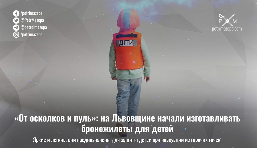 Львовский оборонный кластер начал производить бронежилеты для детей — специальные легкие и яркие модели, предназначенные для защиты во время эвакуации малышей из горячих точек. Первые 30 штук уже переданы госорганам, отвечающим за вывоз школьников из прифронтовых районов.