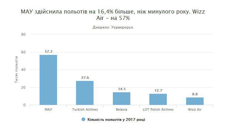 На втором месте Turkish Airlines — 27 606 полётов, что на 20,4% больше, чем в 2016 году. Белорусская Belavia осуществила 14 537 полётов в Украину (на 13,6% больше, чем в прошлом году) и заняла третье место. LOT Polish Airlines — 12 756 полётов и плюс 28,8%, и замыкает пятёрку лоукост Wizz Air Hungary LLC — 8 832 полёта.