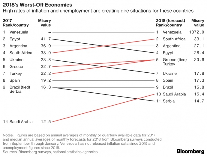 Украина заняла 7-е место в рейтинге «несчастных стран», который высчитывается на основании показателей инфляции и безработицы. Показатели нашей страны в 2018 году улучшились. Если в 2017 году Украина занимала 5-е место в списке наиболее несчастных стран с индексом 23,8, то в текущем году этот показатель вырос до 17,8. Индекс рассчитывается агентством Bloomberg на основе прогнозов экономистов по инфляции и безработице для 66 стран.