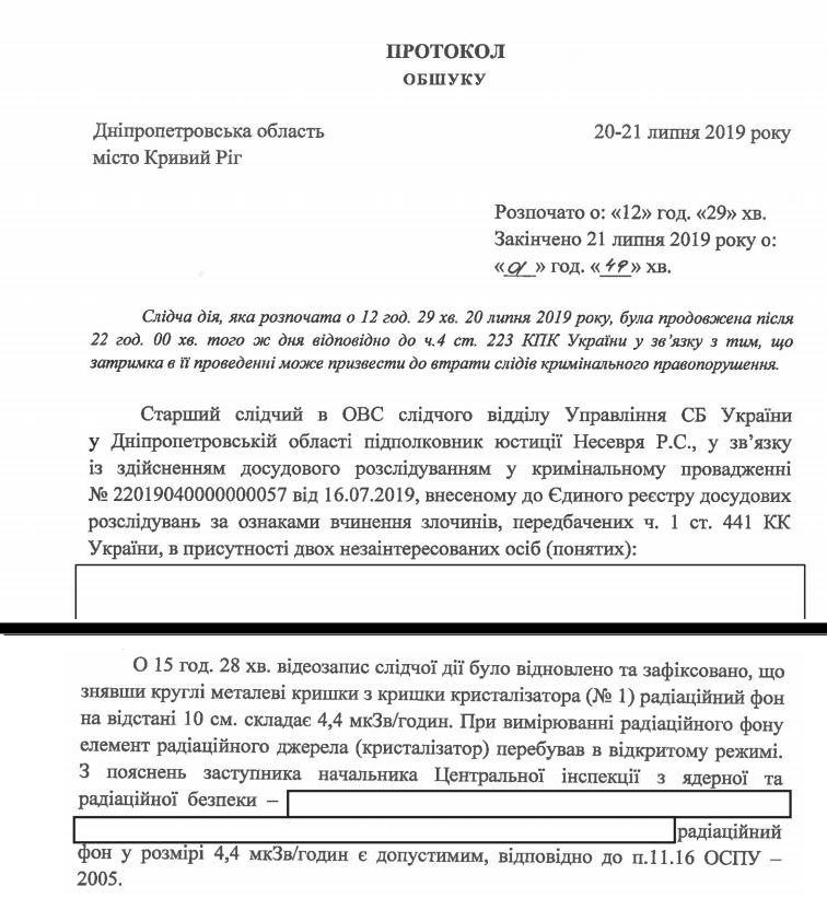 Уровень радиации, который якобы выявила Служба безопасности Украины при обыске ArcelorMittal Кривой Рог, является допустимым. «Сняв круглые металлические крышки с крышки кристаллизатора (часть машины непрерывного литья заготовок — дор.ред.) радиационный фон на расстоянии 10 сантиметров составляет 4,4 мкЗв/час... Из объяснений заместителя начальника Центральной инспекции по ядерной и радиационной безопасности (Лариса Калиушко — дор.ред.), радиационный фон... является допустимым, в соответствии с п.11.16 ОСПУ-2005», — следует из копии протокола обыска СБУ, которое есть в распоряжении LIGA.net.