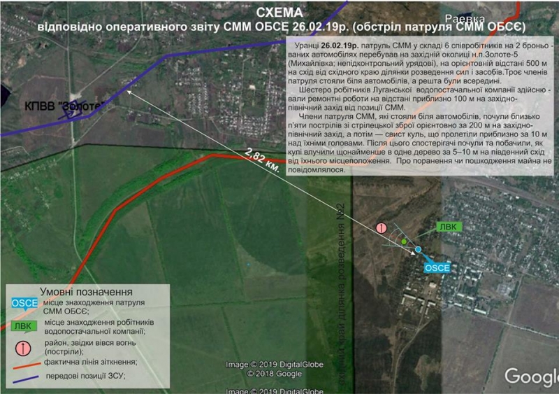 Украинская сторона СЦКК выпустила разъяснение по факту обстрела СММ ОБСЕ и сотрудников ремонтной бригады возле Золотого-5. «Из схемы видно, что огневая позиция, с которой вёлся обстрел в сторону гражданских работников и международных наблюдателей СММ ОБСЕ, может принадлежать только вооружённым формированиям РФ. В указанном районе априори не может быть подразделений Вооруженных Сил Украины в связи с тем, что расстояние до ближайших позиций украинских военных составляет не менее 2800 метров», — сообщает штаб ООС.