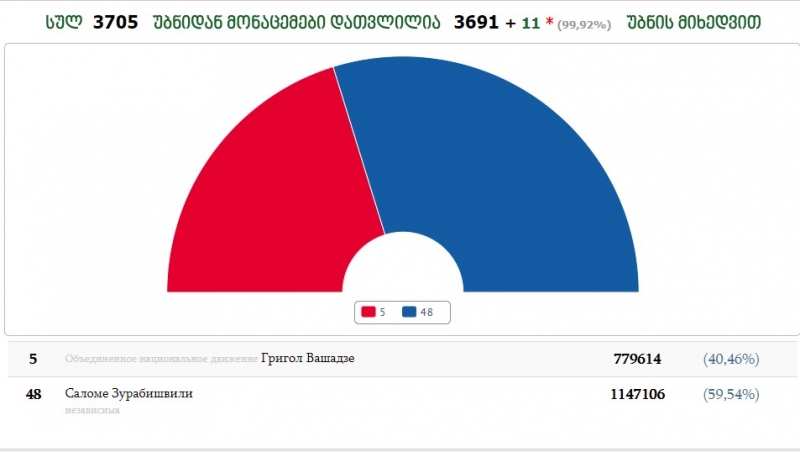 В Грузии накануне прошёл второй тур президентских выборов. Судя по результатам экзит-полов, выиграла кандидат от правящей «Грузинской мечты» Саломе Зурабишвили (набравшая 59,54% голосов по результатам обработки 99,92% бюллетеней). «Все вместе мы отреклись от прошлого, от того, что помешало бы прогрессу Грузии... Мы все — граждане одной страны, мы должны объединиться», — провозгласила она на радостях. Её соперник, оппозиционер Григол Вашадзе набрал 40,46% голосов и пока никаких заявлений делать не стал, зато активизировался поддерживавший его Михеил Саакашвили и уже позвал всех идти на крышу протестовать и требовать досрочных парламентских выборов. «Он обвинил действующие власти в массовых фальсификациях, подкупе избирателей и давлении на них. «Грязный олигарх», как Саакашвили назвал лидера «Грузинской мечты» Бидзину Иванишвили, растоптал закон, Конституцию, демократию и институт выборов», — пишет ГрузияOnline.