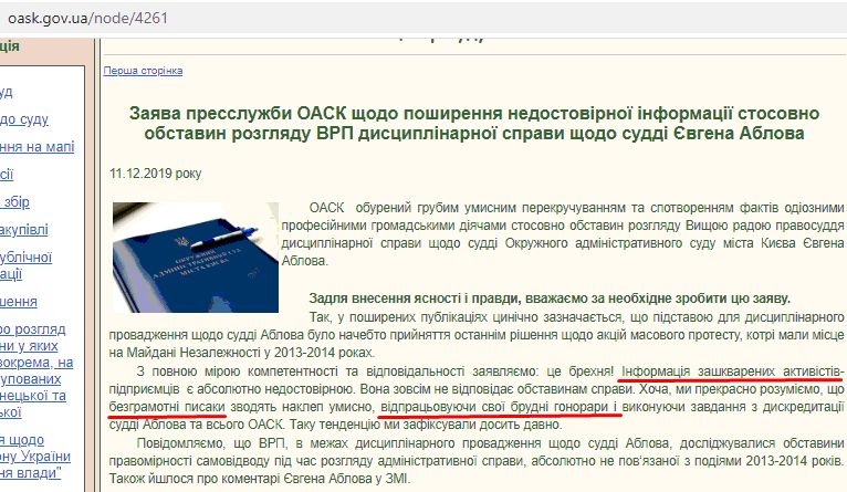 11 декабря ОАСК впечатлил своим официальным заявлением — по их данным, их судья Аблов никогда не имел отношения к делам Майдана, а «информация зашкваренных активистов-предпринимателей является абсолютно недостоверной», потому что «безграмотные писаки» оказывается «отрабатывают свои грязные гонорары». Словно «телеграмных» Дубинского с Бужанским наняли в секретари.