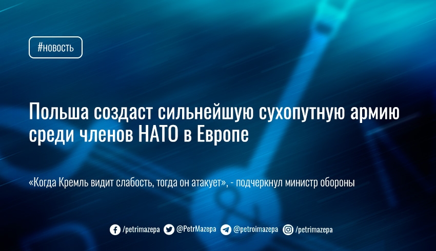 «В конце концов, как по артиллерии, так и по бронетехнике сильнее страны в Европе (чем Польша — ред.) не будет. Среди европейских стран НАТО у нас будут сильнейшие сухопутные войска. Мы находимся на линии фронта, у нас есть граница с Россией на севере и фактически, в военном плане, со стороны Беларуси», — подчеркнул министр.