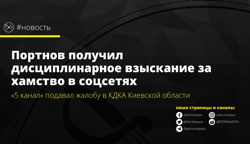 Такое решение стало результатом рассмотрения жалобы ООО «Телерадиокомпания "НБМ"» («5 канал»). В ней приводились примеры того, как Портнов использует свои аккаунты в социальных сетях для угроз и клеймения лиц с противоположными политическими взглядами, сообщает телеканал.
