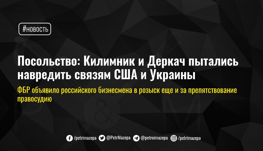 «Российский агент влияния Константин Килимник разыскивается Соединенными Штатами за препятствование правосудию. Вместе с Андреем Деркачем и другими связанными с российской разведкой лицами, он пытался повлиять на выборы в США и повредить связям США и Украины», - значится в сообщении посольства в Twitter. Также отмечается, что Килимника разыскивают за препятствование правосудию и сговор в препятствовании правосудию.