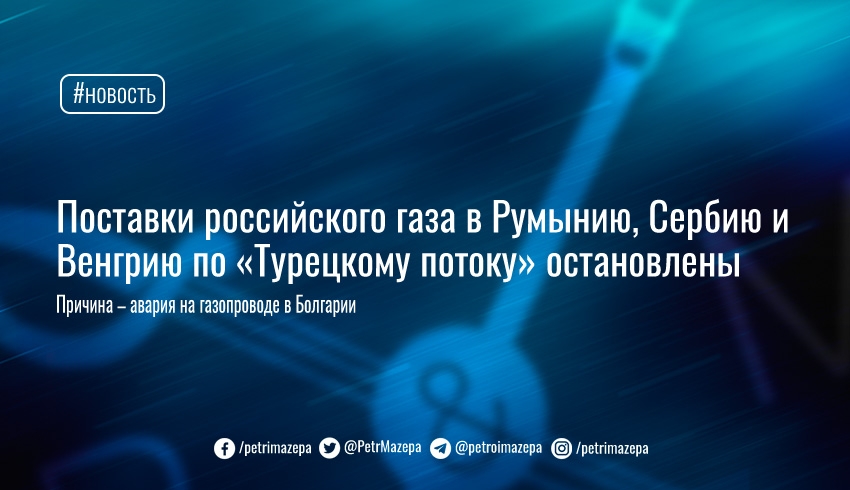 В ночь на 1 ноября поставки российского газа по «Турецкому потоку» через Болгарию в Румынию, Сербию и Венгрию приостановлены из-за аварии на газопроводе «Булгартрансгаза», который является продолжением трубопровода «Турецкий поток».