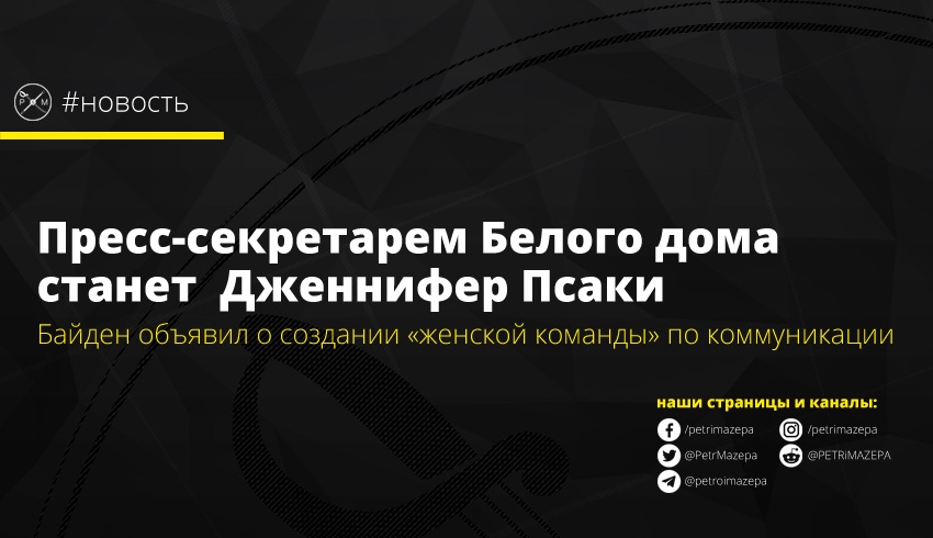 Избранный президент США Джо Байден заявил о своем намерении создать команду по коммуникациям Белого дома, в которой ключевые посты должны занимать женщины. Пресс-секратерем Белого дома планируется назначить бывшую главу пресс-службы Госдепартамента США Джен Дженифер Псаки.